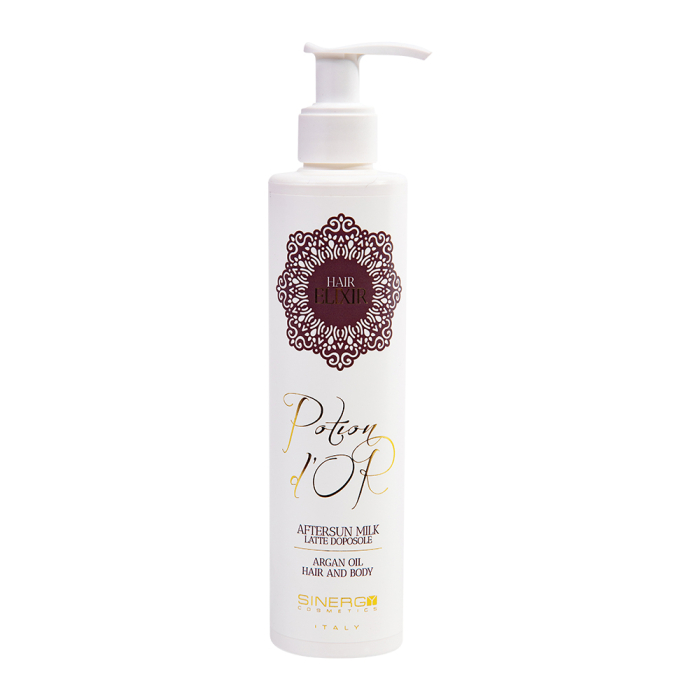 POTION D'OR, lapte matasos after-sun, regenereaza corpul si parul dupa expunerea la vant, soare si sare. Formula sa pretioasa imbogatita cu extract de argan, Fiordaliso (albastrea) si Hamamelis, ofera o hidratare extraordinara. Calmeaza si relaxeaza pielea iar parul devine mai moale si descurcat.