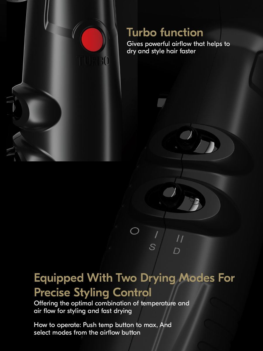 - Functie Turbo: Aceasta functie produce un flux de aer puternic. Reduce semnificativ timpul de uscare. Aceasta contribuie la economisirea timpului si energiei.
